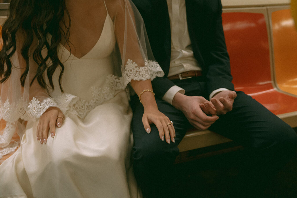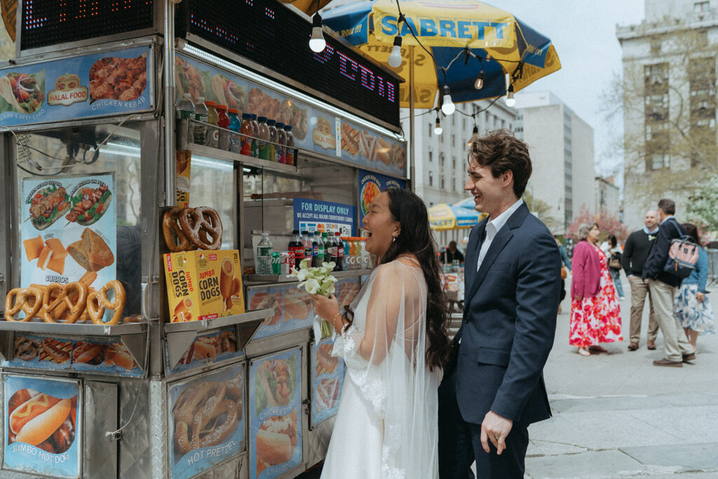 Sometimes couples eat street cart hot dogs in full wedding attire and it becomes one of the best parts of your gallery. Sometimes they take the subway to their own ceremony because why would you do anything else? Sometimes a bride’s dress catches on literally everything at City Hall because the building wasn’t designed with wedding gowns in mind, and all of that is part of the charm.