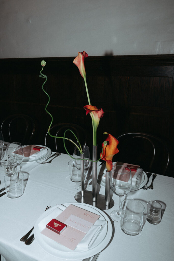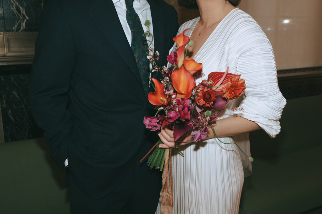 Rachel’s friends gathered closely around her, celebrating in the moment. Someone clapped Dave on the back so hard he stumbled forward. There was confetti sticking to Rachel’s vintage dress. And the vibrant red and orange bouquet from Vivi Fleurz looked even more alive against all that marble and concrete.